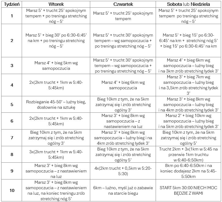 | Dzień 5 | Rozgrzewka (10 min) + 3x (5 min bieg + 1 min marsz) + Schłodzenie (5 min) |